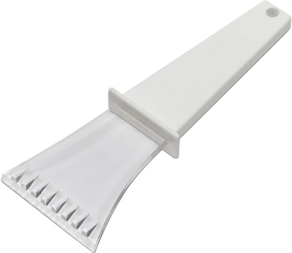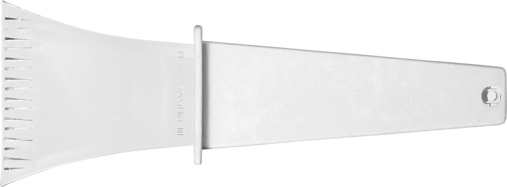 Transparant kunststof ijskrabber met gekleurde handgreep.