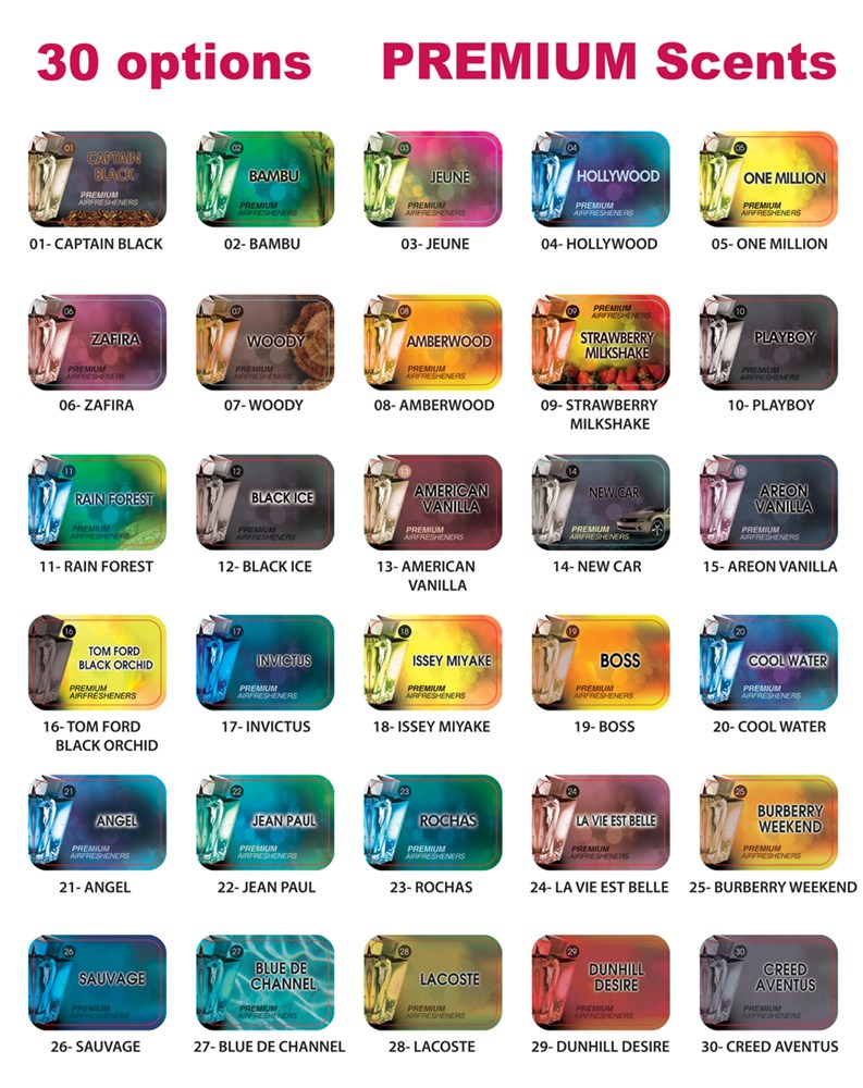 Met een keuze uit maar liefst 60 verschillende geuren – 30 standaard en 30 premium – van frisse citrus tot warme vanilletonen, creëer je de ideale sfeer in elke auto.