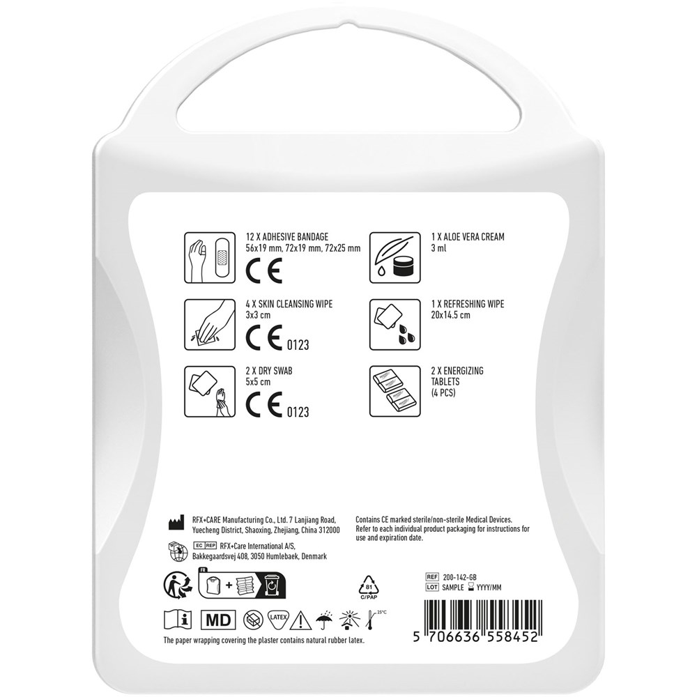 Een MyKit waar je energie van krijgt! Een geweldige giveaway voor het moment als er behoefte aan extra oplettendheid. Uw merk is zal in het oog springen als de nood het hoogst is met dit opvallende plastic koffertje. Inhoud:12 Waterbestendige pleisters, 2 verpakkingen dextro energie (4 stuks), 1 Verfrissingsdoekjes, 1 Aloe vera crème, 4 Vochtige reinigingsdoekjes, 2 Droge reinigingsdoekjes. Alle eerste hulp en verzorgingsartikelen in de kit voldoen aan de EU regelgeving. Prijs is inclusief full colour bedrukking.