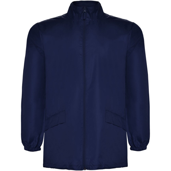 Waterdichte regenjas. Staande kraag en opvouwbare capuchon met verstelbaar trekkoord. Rits aan de voorkant met bijpassende trekker. Twee zijzakken met klep. Elastische manchetten. Elastische band in de zak voor opvouwen en opbergen. Waterdicht model. Het model is 185 cm en draagt maat L.