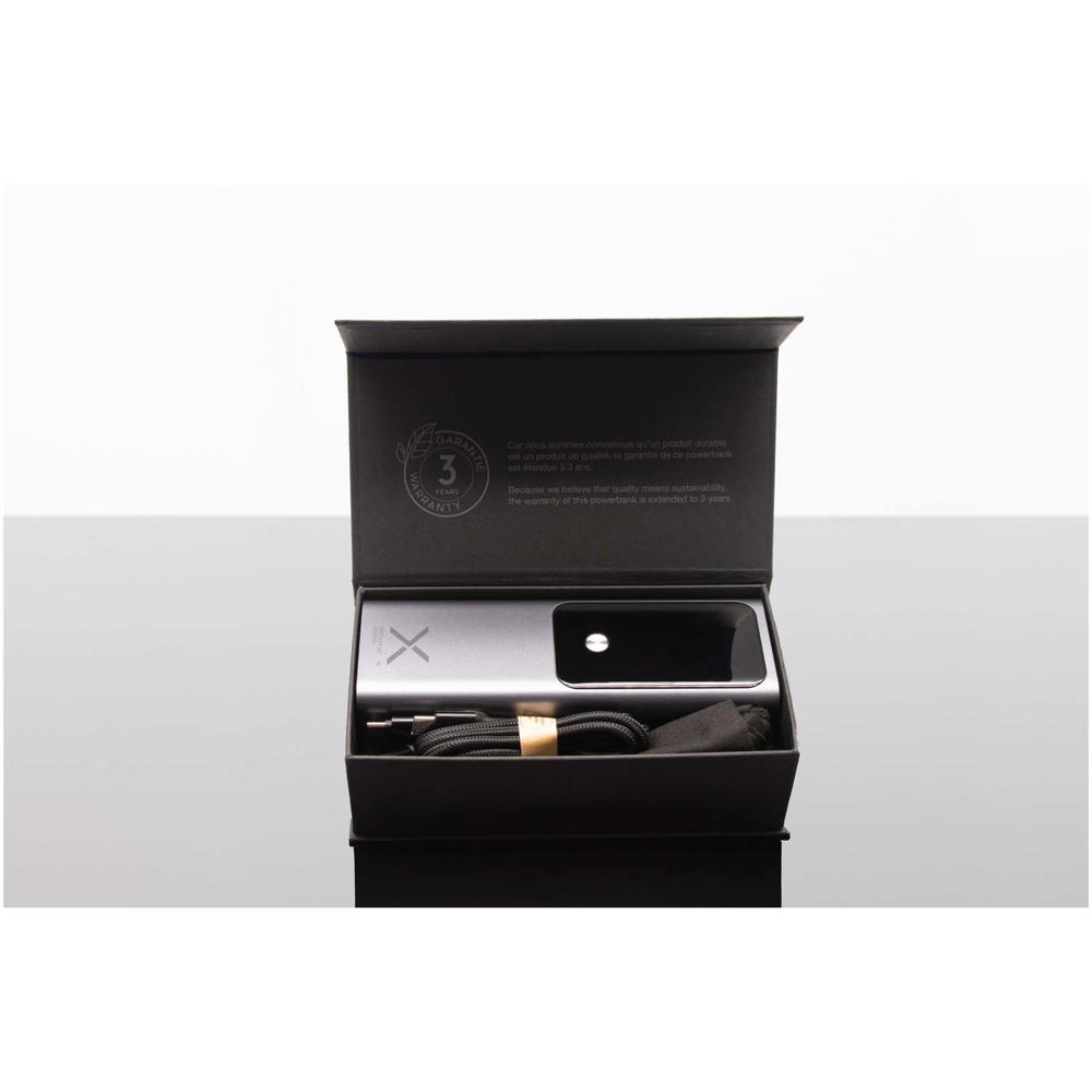 Krachtige laptop powerbank van 100 W (20.000 mAh) die onderweg meerdere apparaten kan opladen met de dubbele USB-C- en USB-A-poort. Met TFT smart display voor real-time batterijstatus. Verpakt in een gerecycled katoenen zakje en geleverd in een gerecyclede kartonnen geschenkverpakking.