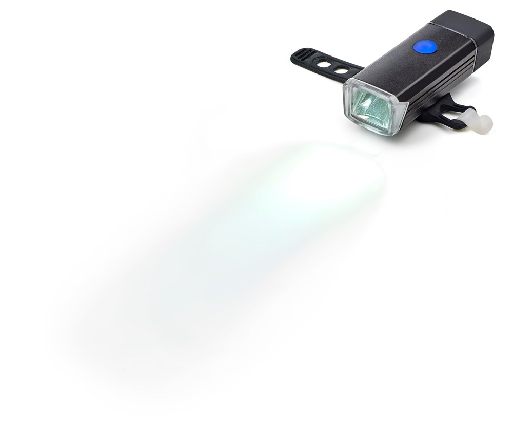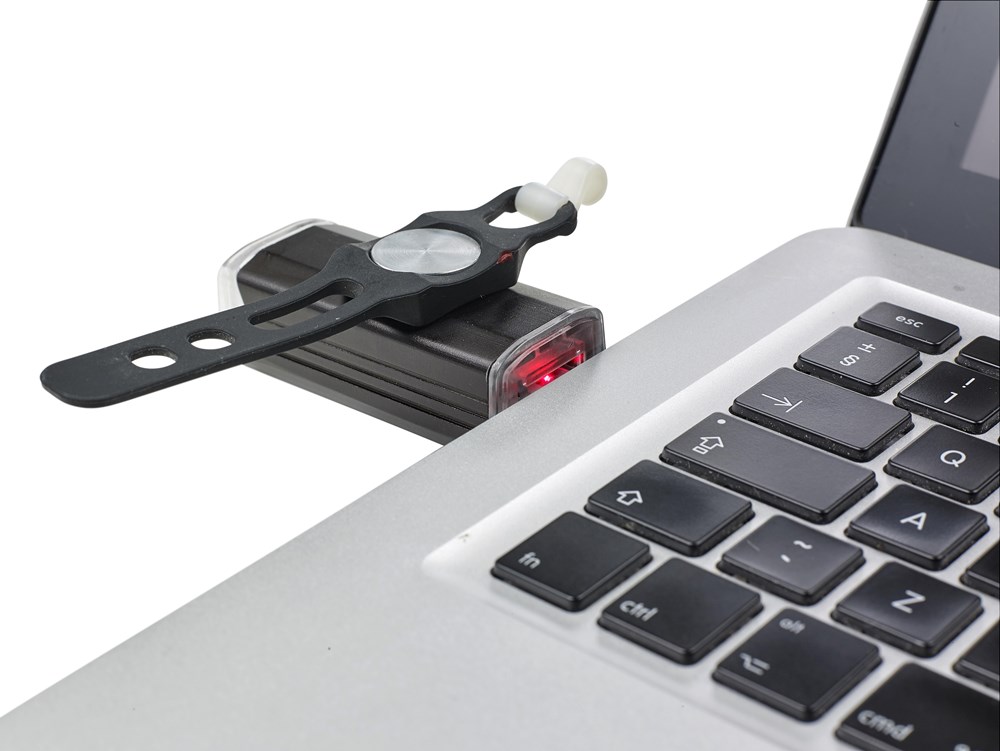USB-oplaadbare COB fietslamp. De lamp heeft 4 standen: continu, gedimd, snel knipperend en langzaam knipperend. Aan- en uitzetten met een drukknop. Het licht heeft een kleine band om het vast te maken aan het stuur.