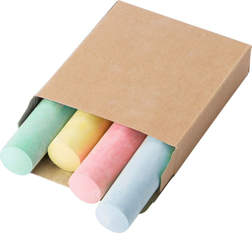 Set stoepkrijt, bestaande uit vier kleuren. Verpakt in bruine cadeauverpakking.